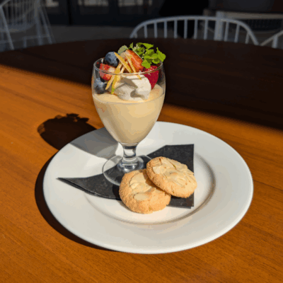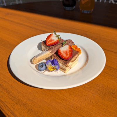Strawberries, chocolate sponge finger, and Frangelico sauce.