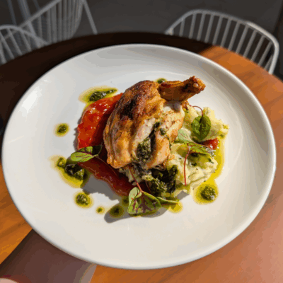 Filled with sweet, scented basil pesto, pine nuts and garlic with creamy bocconcini, lemon parsley mash, and a rich tomato sauce.
